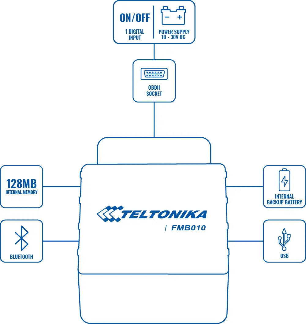 | Configuration and firmware update | FOTA Web, FOTA, Teltonika Configurator (USB, Bluetooth), FMBT mobile application (Configuration) |