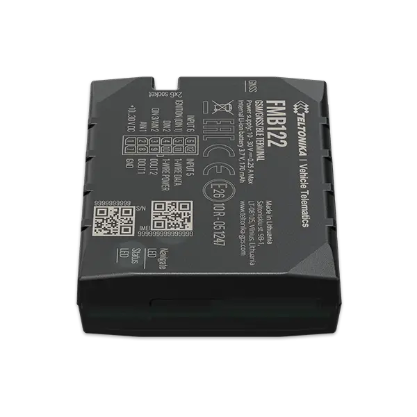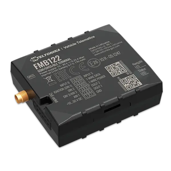 FMB122 small and professional tracker with internal high gain GSM and external GNSS antennas, which is able to collect device coordinates and other useful data and transfer them via GSM network to server. This device is perfectly suitable for applications where location acquirement of remote objects is needed: fleet management, car rental companies, taxi companies, public transport, logistics companies, personal cars and so on. FMB122 can perform tasks on remote objects, such as monitoring engine status, controlling truck’s door etc.