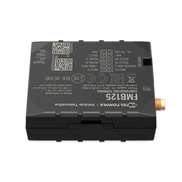 FMB125 small and professional tracker with internal high gain GSM and external GNSS antennas, which is able to collect device coordinates and other useful data and transfer them via GSM network to server. This device is perfectly suitable for applications where location acquirement of remote objects is needed: fleet management, car rental companies, taxi companies, public transport, logistics companies, personal cars and so on. FMB125 can perform tasks on remote objects, such as monitoring engine status, controlling truck’s door etc.